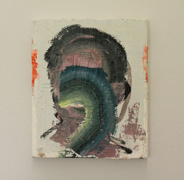Andreas Golder’s two larger paintings in the gallery Kuss and Illustration für J. P. Sartre have 3 steps to ‘refinement’: prepare canvas with thick gesso; coat with black glossy layer of oil paint; apply a gestural impasto layer of pink and red to illustrate a scene or thing. As he said during the gallery conversation, the reflective surface gives enough information that there is no need to overcomplicate things in the gestural passages. The impact of his paintings are instantaneous, helped along with his fetishistic use of material. Linseed oil flows over the edges of the unprimed canvas. Choppy black crusts of paint reach beyond the border of the paint stretcher. Cynically, his paint application is perfect for the art market conveyor belt (I don’t think he would disagree), and have enough impact to hold the collector’s attention for the check book to be unfolded. But there is more to the work than surface and being obligated to the gallery and art market. I fell in love with them as soon as we opened the wooden crate in the gallery; time will tell if it was a one night stand...